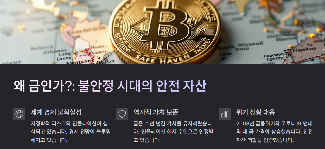 세계 정세의 긴장과 경기 하강 우려가 날로 고조되는 현재, 안전자산에 대한 관심이 그 어느 때보다 높아지고 있습니다. 특히 금은 오랜 역사 동안 위기 상황에서 자산 가치를 보존하는 든든한 방패 역할을 해왔습니다. 인플레이션 헤지 기능으로도 주목받는 금은 현대 투자 포트폴리오에서 필수적인 요소로 자리잡고 있습니다.