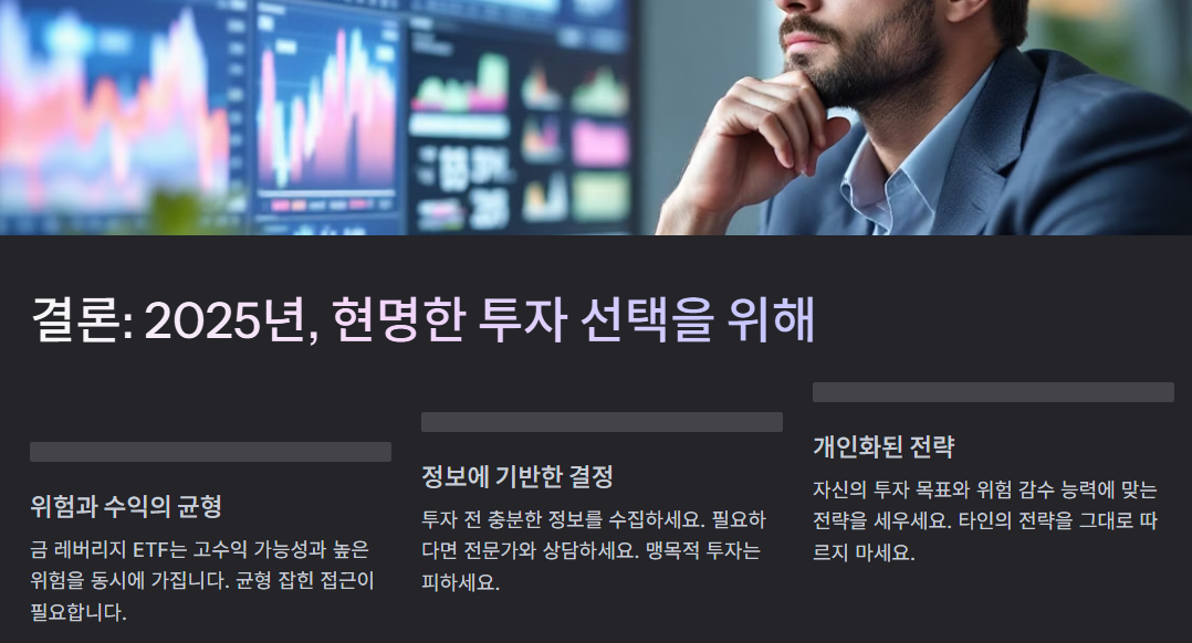 2025년을 향해 가는 현재, 금 레버리지 ETF는 적절한 위험 관리와 함께 활용한다면 포트폴리오의 수익률을 높이는 효과적인 도구가 될 수 있습니다. 다만, 그 특성과 위험을 충분히 이해하고 자신의 투자 목표와 성향에 맞게 신중하게 접근하는 것이 무엇보다 중요합니다.
