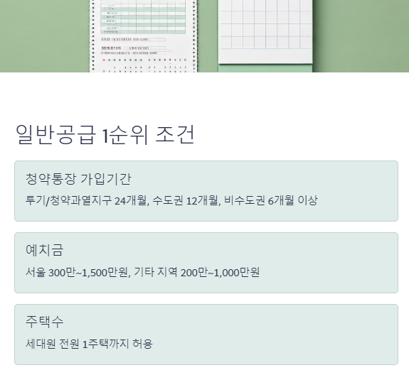 예를 들어 수도권 거주자가 청약통장 13개월, 예치금 500만 원을 보유하면 1순위 자격이 됩니다.