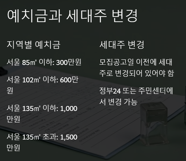 예를 들어, 서울 84㎡ 아파트에 청약하려면 예치금 300만 원 이상이 필요합니다.