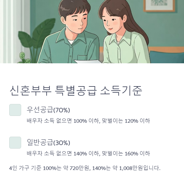 우선공급(70%): 배우자 소득이 없는 경우 100% 이하, 두 사람 모두 소득이 있으면 120% 이하