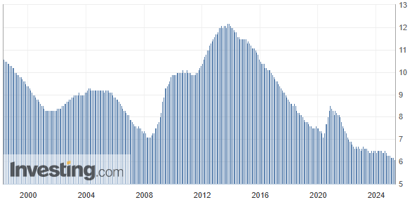 2025년 2월 기준 유로존 실업률은 6.1%로, 1월의 6.2%에서 소폭 하락했습니다. 이는 시장 예상치인 6.2%보다 개선된 수치로, 유로존 경제의 회복력을 보여주는 중요한 지표입니다. 실업자 수는 전월 대비 7만 명 감소한 1,058만 명으로 집계되었으며, 1년 전 6.5%와 비교해도 뚜렷한 개선을 보였습니다.