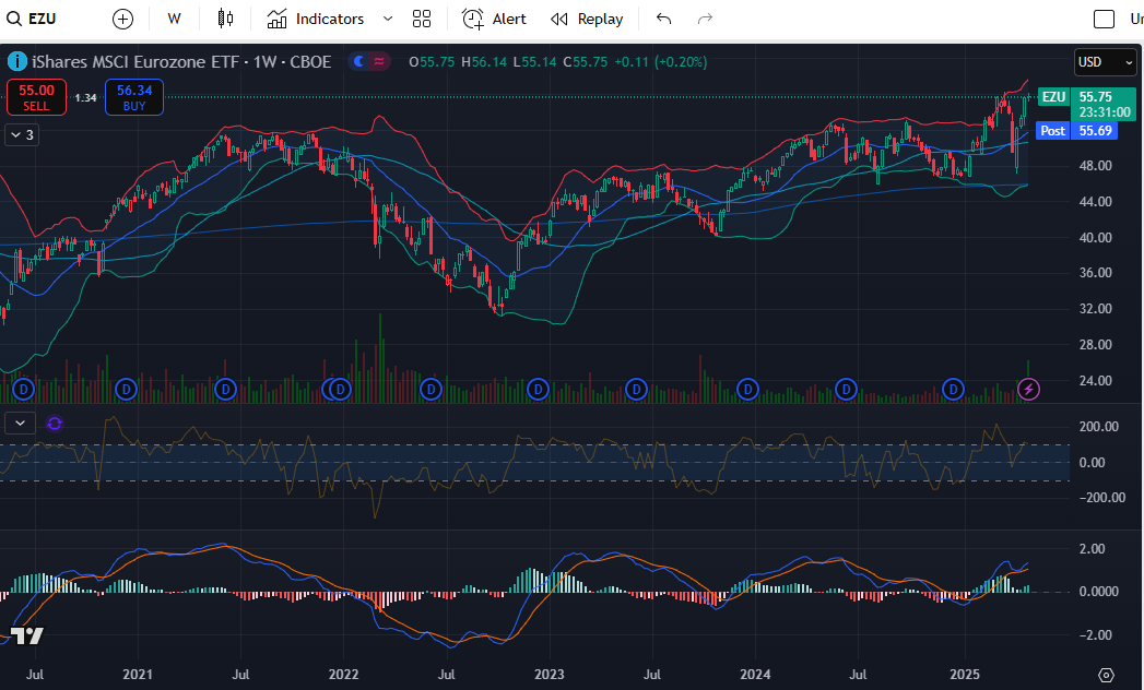 iShares MSCI Eurozone ETF (EZU)는 최근 강한 상승세를 보이며 주간 차트상 볼린저 밴드 상단을 돌파했고, 거래량도 크게 증가하며 추세의 신뢰도를 높이고 있습니다. 기술적 지표상 MACD는 골든크로스를 형성하며 상승 모멘텀을 나타내고 있고, RSI는 70에 근접해 단기 과매수 구간에 진입하고 있음을 시사합니다. 전반적으로 유로존 시장에 대한 투자 심리가 긍정적으로 작용하고 있으며, 단기적으로는 눌림목 조정 이후 추가 상승 여력을 기대할 수 있는 구간입니다.
