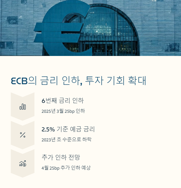 유럽중앙은행(ECB)은 2025년 3월에 기준금리를 25bp 인하했으며, 이는 2024년 완화 주기가 시작된 이후 여섯 번째 금리 인하였습니다. 이로 인해 기준 예금 금리는 2.5%로 하락했고, 이는 2023년 초 수준으로 돌아간 것입니다.