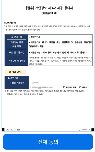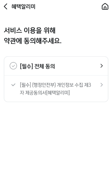 - ‘혜택알리미 시작하기’ 클릭 → 서비스 이용 약관 동의