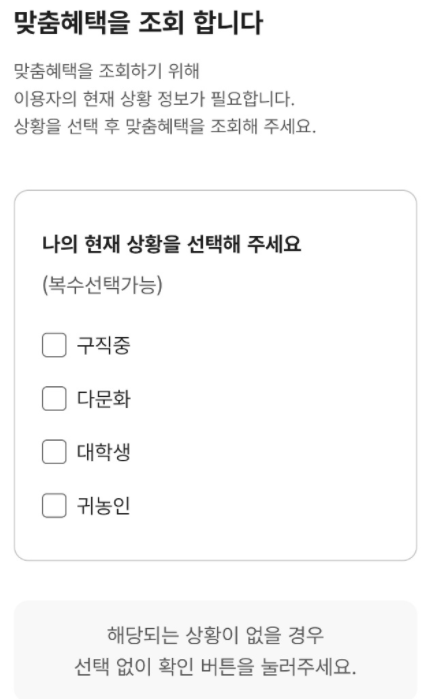 - ‘맞춤조회’ 클릭 시 본인에게 해당하는 혜택 리스트 확인