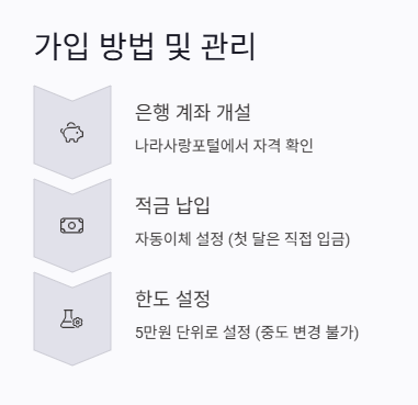 - 한도 상향 신청: 기존 가입자는 은행 앱에서 상향 신청(2025년부터), 신규 가입자는 5만 원 단위로 한도 설정(중도 변경 불가)