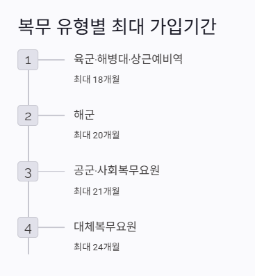 - 복무별 최대 가입기간 확인: 육군·해병대·상근예비역 18개월, 해군 20개월, 공군·사회복무요원 21개월, 대체복무요원 24개월
