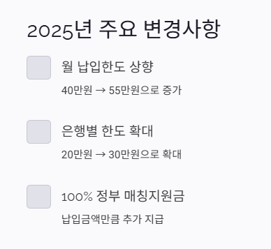 - 월 최대 납입 한도: 40만 원 → 55만 원으로 상향