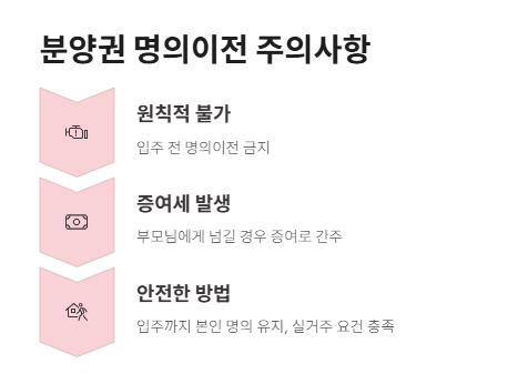 - 분양권 상태에서 명의이전은 원칙적으로 불가하며, 부모님에게 넘길 경우 '증여'로 간주되어 증여세가 발생합니다.