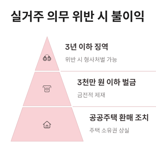 - 부부 공동명의로 변경하는 것도 거주의무 기간 내에는 불법이며, 위반 시 3년 이하 징역 또는 3천만 원 이하 벌금, 공공주택의 경우 환매 조치까지 받을 수 있습니다.