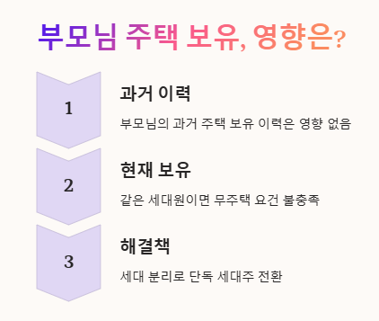 - 부모님이 현재 무주택이라면: 신청자와 부모님 모두 무주택 세대원이므로 자격 유지에 문제가 없습니다.