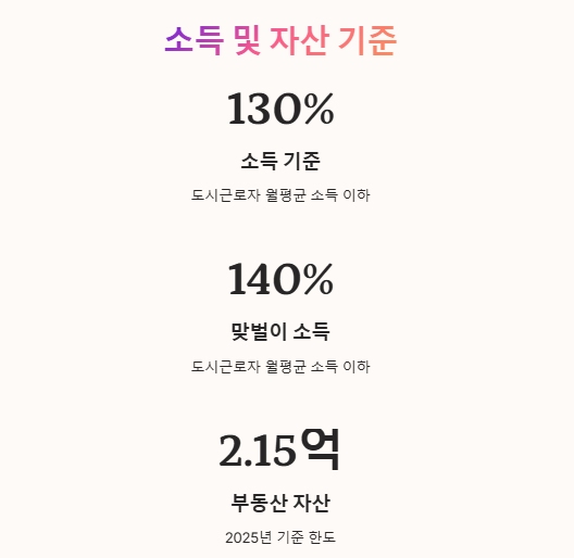 - 부동산 및 자동차 등 자산 기준(2025년 기준 부동산 2억 1,550만 원 이하, 자동차 3,683만 원 이하)을 충족해야 합니다.