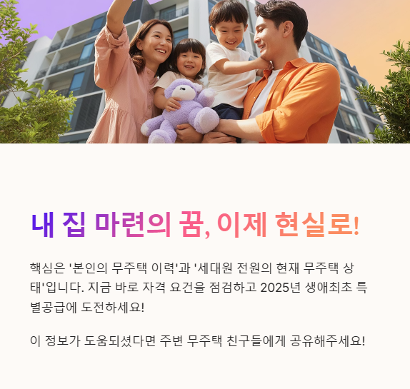 지금 바로 본인의 무주택 요건과 세대 구성을 점검하고, 2025년 생애최초 특별공급 청약에 도전해보세요!
