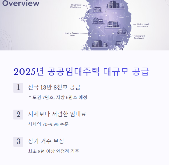 정부는 2025년 공공지원 민간임대 청약을 포함한 공공임대주택을 전국 13만 8,000호 이상 공급할 계획입니다. 수도권 3기 신도시와 인천, 대전 등에서 대규모 입주자 모집이 예정되어 있으며, 중산층과 주거지원계층 모두를 아우르는 다양한 유형이 준비됩니다.