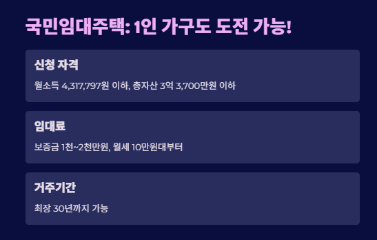 | 1인 가구 | 4,317,797원 이하 | 3억 3,700만 원 | 3,803만 원 이하 | 국민임대주택 기준 |