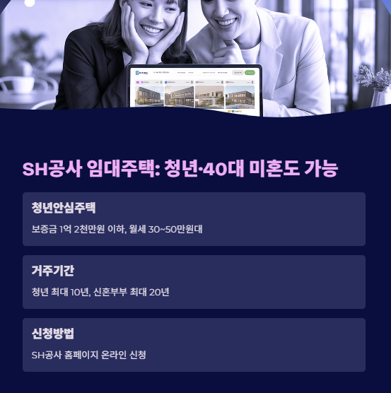 서울주택도시공사(SH)는 청년, 신혼부부, 일반 1인 가구를 위한 다양한 임대주택을 공급합니다. 2025년 SH 청년안심주택의 경우, 보증금 1억 2천만 원 이하, 월세 30~50만 원대가 일반적입니다. 40대 미혼 1인 가구도 소득·자산 기준만 맞으면 신청할 수 있습니다.
