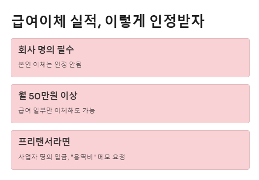 - 프리랜서라면, 사업자 명의 입금 및 정기적(매월) 50만 원 이상 입금, 입금 메모에 "용역비" 또는 "급여" 요청 등으로 실적 인정 가능성이 높아집니다.