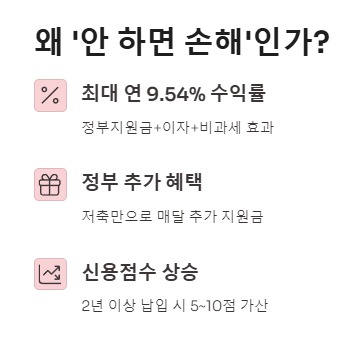 - 최대 연 9.54%의 실질 수익률: 정부지원금+이자+비과세 효과로 시중 적금 대비 월등한 수익.