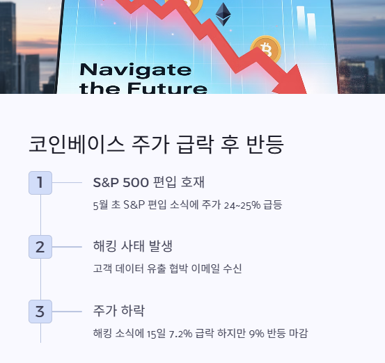 코인베이스는 2025년 5월 13일 S&P 500 지수에 편입될 예정이었으며, 이 소식에 힘입어 13일 하루 만에 주가가 24~25% 급등하는 모습을 보였습니다. 하지만 해킹 사실이 공개되자, 주가는 급락하며 15일에는 7.2% 하락하였으나 16일 9% 반등하는 변동성을 보였습니다. 전문가들은 시장의 과도한 반응을 지적하며, 코인베이스가 적절히 대응한다면 장기적으로 신뢰 회복이 가능하다고 보고 있습니다.