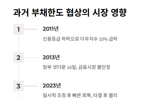 2013년 부채한도 연장 실패로 정부 셧다운이 16일간 지속되면서 글로벌 금융시장은 일시적 불안정을 경험했습니다. 반면 2023년에는 시장이 일시적 조정 후 빠르게 회복했고, 협상 시한 직전에 극적으로 타결되어 안도감을 주는 랠리가 형성되었습니다.