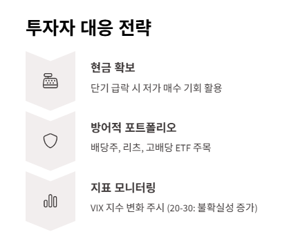 배당주, 리츠, 고배당 ETF 등 방어형 종목군에 주목하는 것이 좋겠습니다. 또한 S&P500, 나스닥100, 미국채 ETF 등 분산 투자를 통해 중장기 자산 비중을 유지하는 전략을 고려해볼 만합니다.
