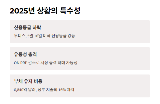 2023년 부채한도 협상 타결 후에는 재무부가 TGA(재무부 일반계정)를 채우기 위해 6주간 520억 달러, 이후 3.5개월간 320억 달러, 총 840억 달러의 유동성을 시장에서 흡수했습니다. 당시에는 ON RRP(오버나이트 역환매조건부채권)를 통해 대부분 흡수되었으나, 현재는 ON RRP가 대폭 감소하여 시장 충격이 더 클 것으로 예상됩니다.