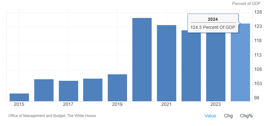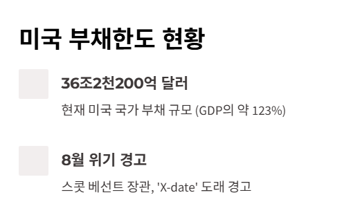 미국 연방정부의 부채한도 유예기간이 2025년 1월 1일부로 종료되었고, 현재 미국의 국가 부채는 약 36조2천200억 달러에 달합니다. 이는 미국 GDP의 약 124%로, 역대 최고치에 근접한 수준입니다. 현재 법적 부채한도는 36조1천억 달러로 설정되어 있어 이미 한도를 초과한 상태이며, 재무부는 특별 조치를 통해 시간을 벌고 있습니다.