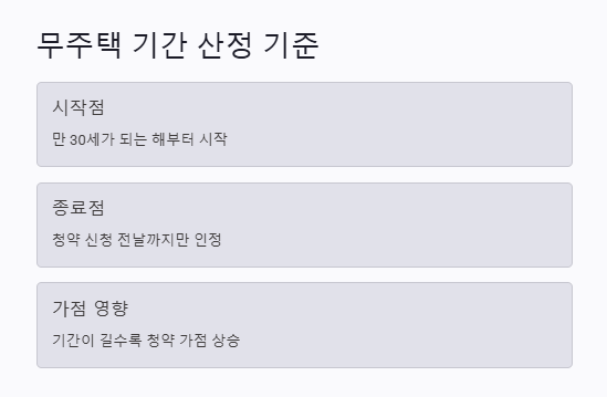 청약 무주택 기간은 청약 신청 전날까지의 기간만 인정됩니다. 만 30세가 되는 해부터 무주택 기간이 시작되어, 청약 당첨 전날까지의 기간이 점수에 반영됩니다. 무주택 기간이 길수록 청약 가점이 높아지므로, 청약 당첨 전까지 무주택 상태를 유지하는 것이 핵심입니다.