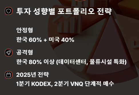 안정형 투자자라면 한국 리츠 ETF 60% + 미국 리츠 ETF 40% 비중을 권장합니다. 9%대의 고배당 수익을 유지하면서 글로벌 분산 효과를 누릴 수 있는 조합입니다. 공격형 투자자의 경우 국내 특화 부문(데이터센터, 물류시설)에 집중된 한국 ETF에 80% 이상 배분하는 전략이 효과적입니다.