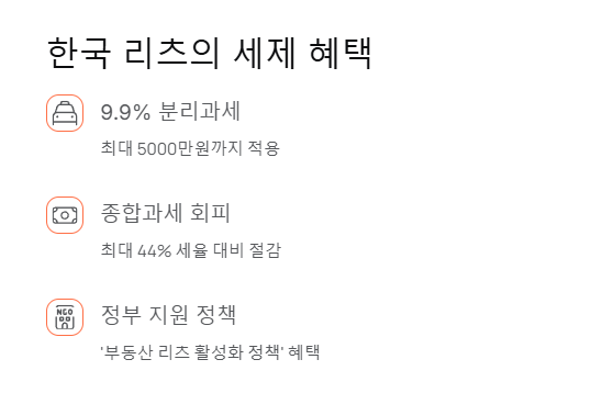 한국 리츠 ETF의 최대 강점은 세제 혜택입니다. 2025년 새로 도입된 '부동산 리츠 활성화 정책'에 따라 KODEX 부동산리츠 ETF 3종에 한해 최대 5000만 원까지 배당소득을 9.9% 분리과세로 처리할 수 있습니다. 이는 기존 금융소득종합과세(최대 44%) 대비 절감 효과가 극대화되는 시스템입니다.
