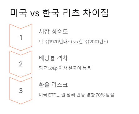 미국과 한국 리츠 ETF 간 평균 5%p 이상의 배당률 격차는 시장 성숙도 차이에서 기인합니다. 미국은 1970년대부터 발달된 REIT 시장을 보유한 반면, 한국은 2001년 도입 후 아직 성장 단계에 있습니다. 이에 따라 한국 리츠는 높은 수익률로 투자자를 유치하려는 전략을 펼치고 있습니다.