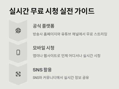 각 방송사 공식 홈페이지와 유튜브 채널에서 실시간 스트리밍을 제공하므로, 별도의 가입이나 결제 없이 무료로 시청할 수 있습니다. - OTT 플랫폼 활용하기