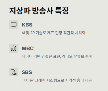 - KBS: AI 및 AR 기술을 활용해 실시간 개표 현황을 직관적으로 시각화합니다.