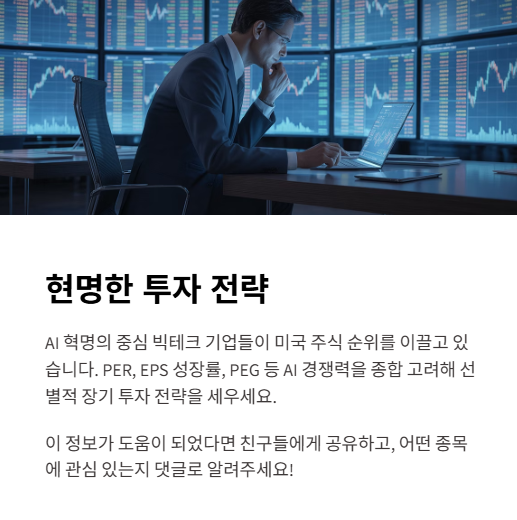 AI 혁명의 중심에 있는 빅테크 기업들은 미국 주식 순위를 이끄는 원동력입니다. PER, EPS 성장률, AI 경쟁력 등을 종합 고려해 선별적 장기 투자 전략을 세우는 것이 바람직합니다.