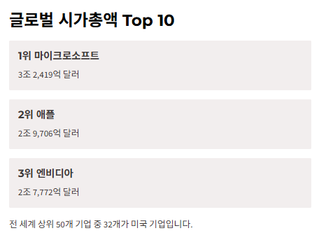 2024년 대비 마이크로소프트가 애플을 제치고 1위로 올라섰고, 엔비디아가 3위로 상승하며 AI/반도체의 영향력이 확대되고 있습니다.