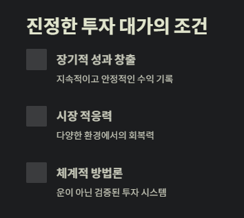 진정한 투자 대가를 구분하는 핵심 요소는 다음과 같습니다.