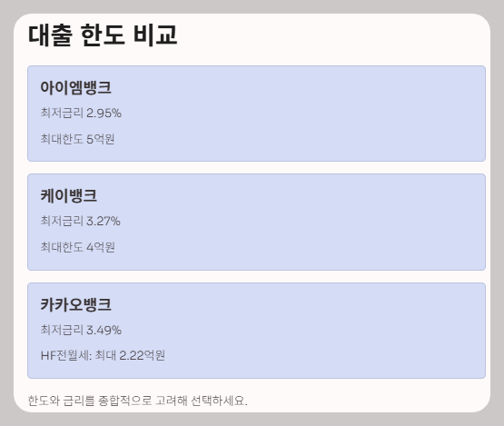 | 금융기관 | 최저 금리 | 최대 한도 |