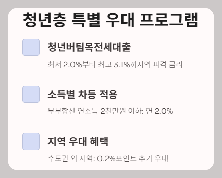 청년버팀목전세대출은 최저 2.0%부터 최고 3.1%까지의 파격적인 금리 혜택을 제공하며, 부부합산 연소득 2천만원 이하 구간에서는 연 2.0% 금리가 적용됩니다. 수도권 외 지역 거주자에게는 0.2%포인트 추가 우대 혜택이 제공됩니다.