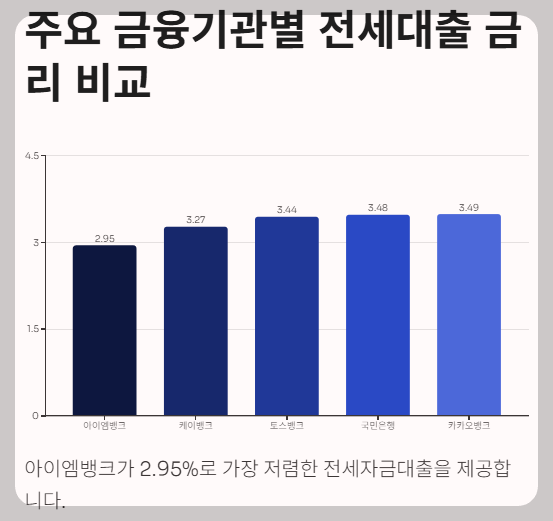현재 시장에서 가장 경쟁력 있는 전세자금대출 금리를 제공하는 기관들을 살펴보면, 아이엠뱅크가 2.95%로 가장 낮은 수준을 보여주고 있습니다. 이어서 케이뱅크 3.27%, 토스뱅크 3.44%, 국민은행 3.48%, 카카오뱅크 3.49% 순으로 경쟁력 있는 조건을 제시하고 있습니다.