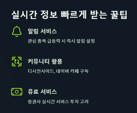 - 증권사 유료 서비스 고려: 실시간 시세와 뉴스가 반드시 필요한 경우, 증권사의 유료 실시간 서비스 가입을 추천합니다. 비용은 연간 수만 원 수준으로, 투자 수익을 고려하면 충분히 투자할 가치가 있습니다.