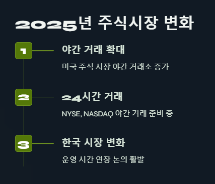 미국 주식 시장은 2025년 들어 야간 거래소(ATS)가 크게 늘어나고, 뉴욕증권거래소(NYSE)와 나스닥(NASDAQ) 등 정규 거래소도 야간 거래를 준비하고 있습니다. 이로 인해 미국 주식 시장은 거의 하루 종일 거래가 가능해질 전망입니다. 한국 주식 시장 역시 글로벌 투자자 유치와 시장 경쟁력 강화를 위해 운영 시간 연장 논의가 활발하게 이루어지고 있습니다.